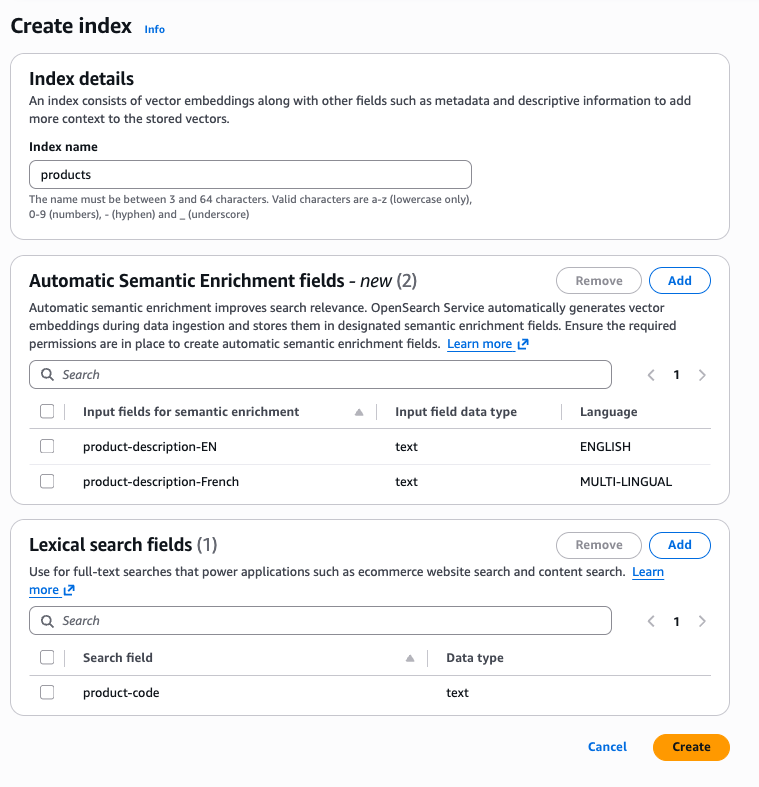 Das Einrichten eines Indexes mit aktivierter automatischer semantischer Anreicherung für Ihre Textfelder ist einfach. Sie können ihn während der Erstellung eines neuen Indexes über die Konsole und CloudFormation Vorlagen verwalten. APIs Um ihn für einen vorhandenen Index zu aktivieren, müssen Sie den Index mit aktivierter automatischer semantischer Anreicherung für Textfelder neu erstellen.