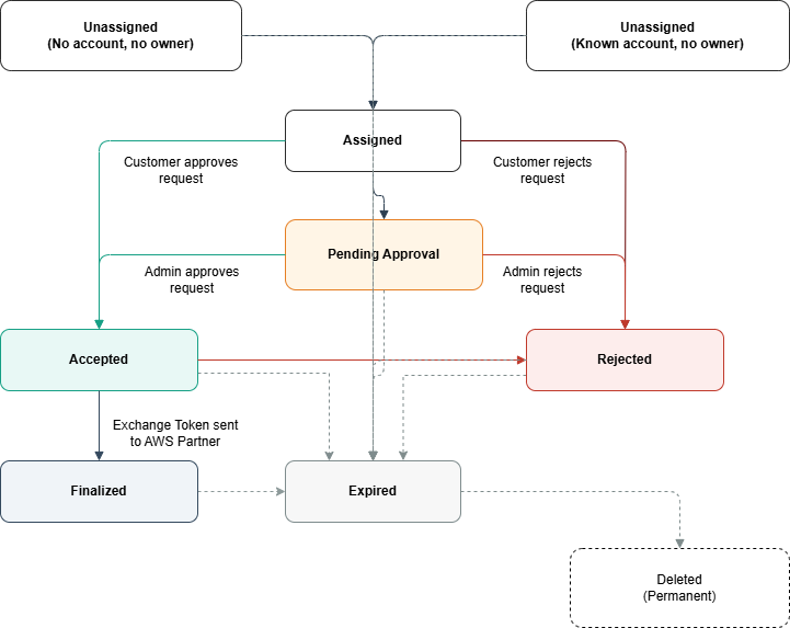 | Sin asignar | Solicitud creada, pero aún no asociada a ninguna cuenta de cliente ni entidad principal de IAM. Es posible que la solicitud se haya creado sin especificar una cuenta de destino o con un ID de cuenta de destino, pero el propietario de la cuenta aún no la reclamó. |