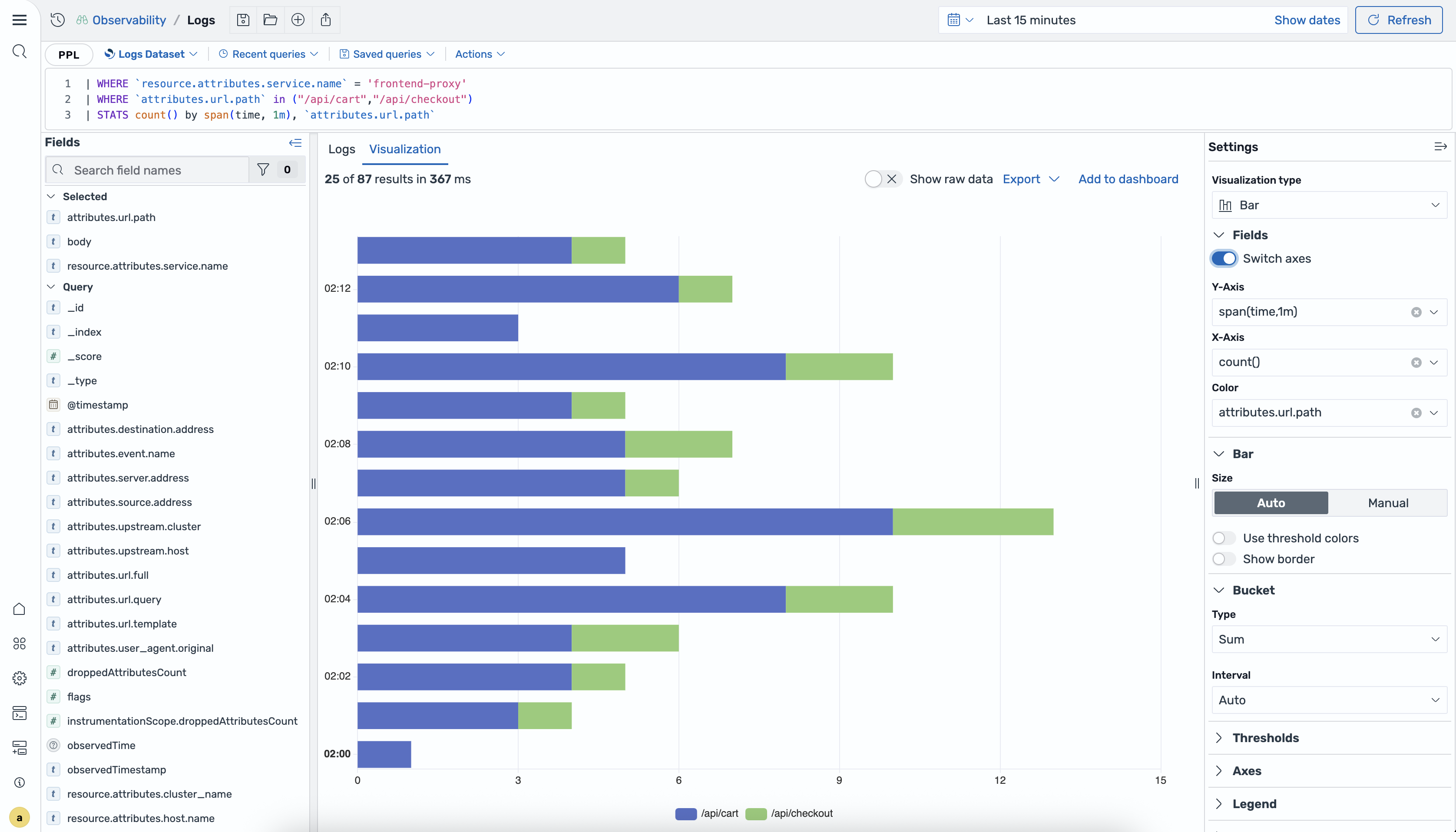 Puede crear visualizaciones directamente a partir de los resultados de sus consultas de PPL. Utilice el stats comando para agregar datos para su visualización: