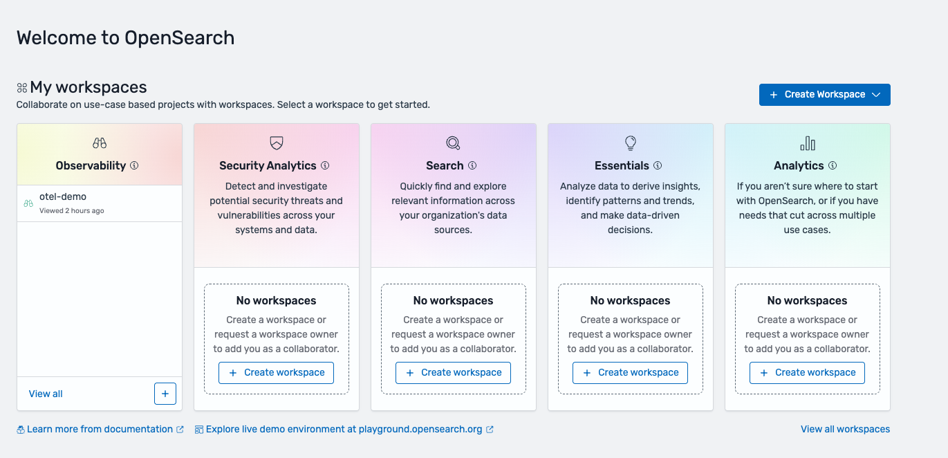 Remarque — Pour faciliter la prise en main, nous avons créé un nouveau flux de travail Get Started pour les journaux dans la console Amazon OpenSearch Service qui configurera un nouveau pipeline d'ingestion OTel personnalisé, vous permettra de sélectionner un OpenSearch cluster existant et de créer une nouvelle application d' OpenSearch interface utilisateur avec un espace de travail d'observabilité créé. Il vous suffit de diriger vos OTel agents vers le nouveau point de terminaison d'ingestion et vous êtes prêt à obtenir des informations sur vos données OTel formatées.