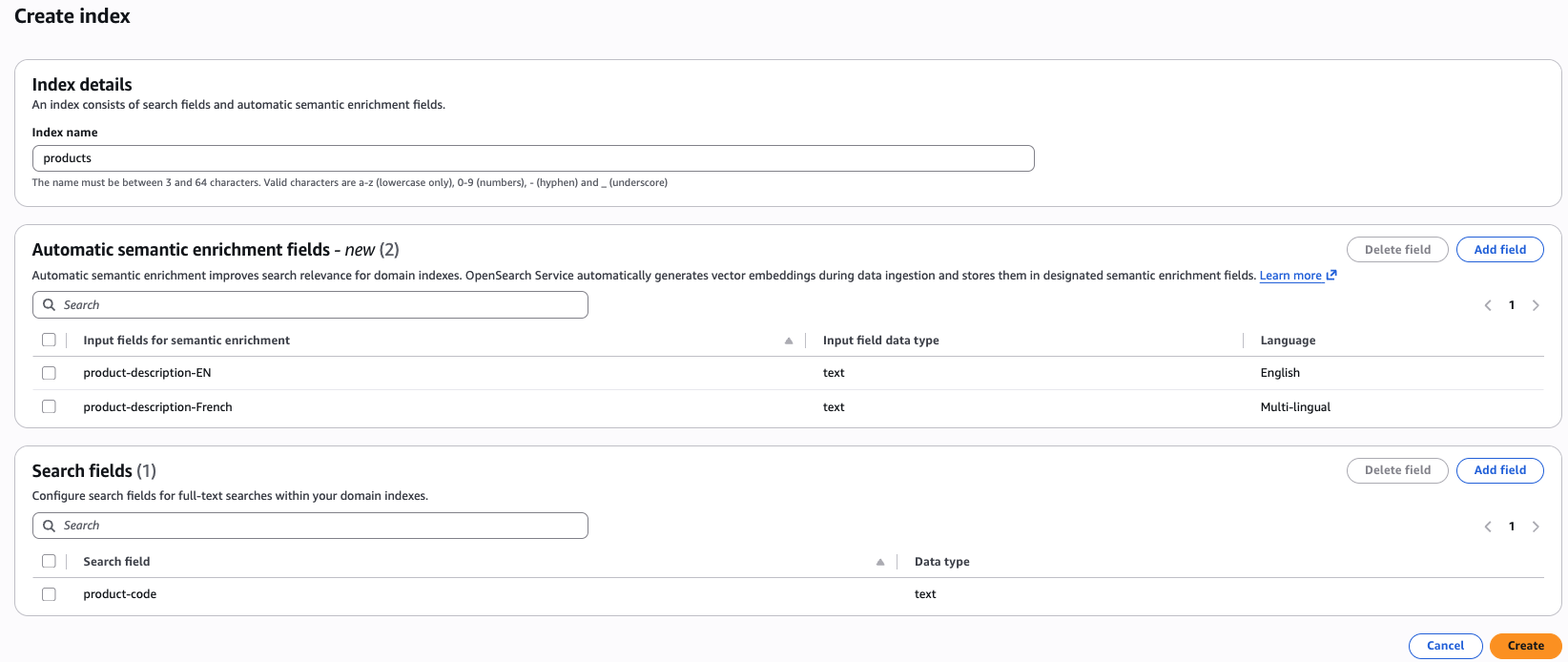 Expérience de console - La AWS console vous permet de créer facilement un index avec des champs d'enrichissement sémantique automatiques. Une fois que vous avez sélectionné un domaine, vous trouverez le bouton de création d'index en haut de la console. Une fois que vous avez cliqué sur le bouton de création d'index, vous trouverez des options permettant de définir des champs d'enrichissement sémantique automatique. Dans un index, vous pouvez combiner l'enrichissement sémantique automatique pour l'anglais et le multilingue, ainsi que des champs lexicaux.