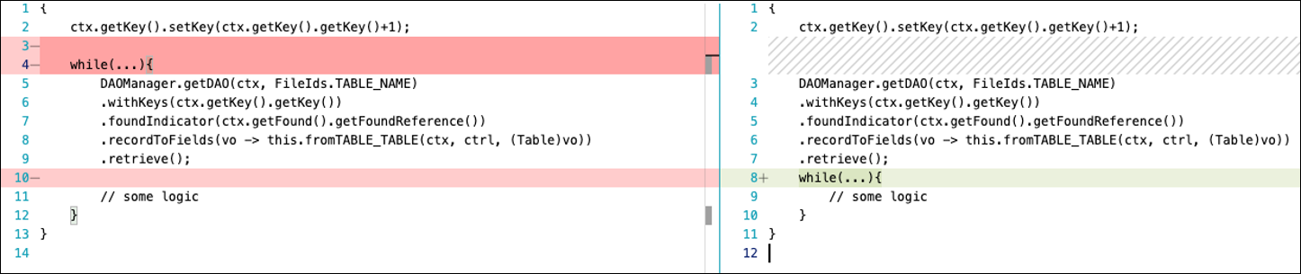 Updating data directly in the database. Restructure your business logic by using direct SQL updates instead of multiple DAOManager operations with loops. For example, the following code (left side) makes multiple database calls and uses excessive memory. Specifically, it uses multiple database read and write operations within loops, individual updates instead of batch processing, and unnecessary object creation for each iteration.