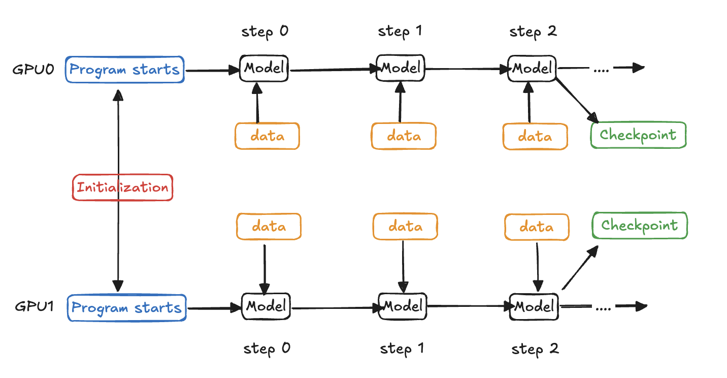 Riduzione del sovraccarico di riavvio del programma: riduci al minimo i costi di riavvio e abilita il rifornimento senza checkpoint attraverso il ripristino del processo su nodi integri (riquadri blu e verdi di seguito).