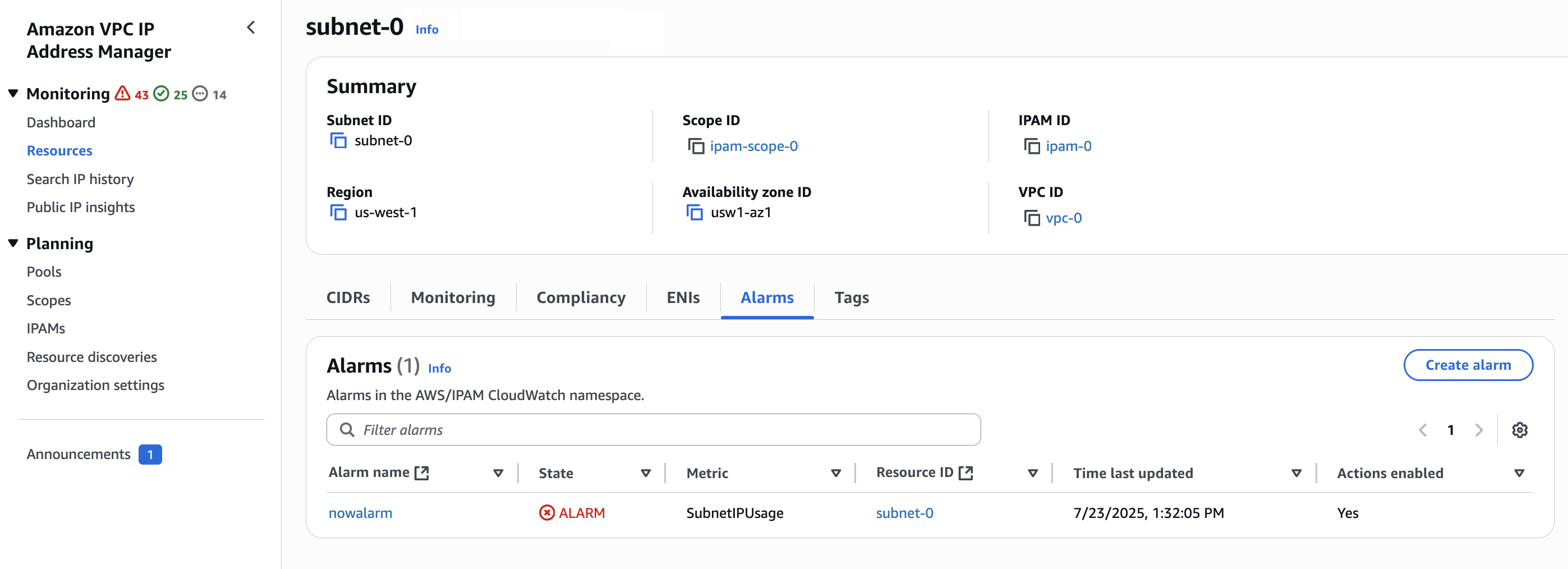 To manage alarms for specific resources, choose Resources, then choose a VPC, subnet, or pool. When the resource details page opens, choose the Alarms tab.